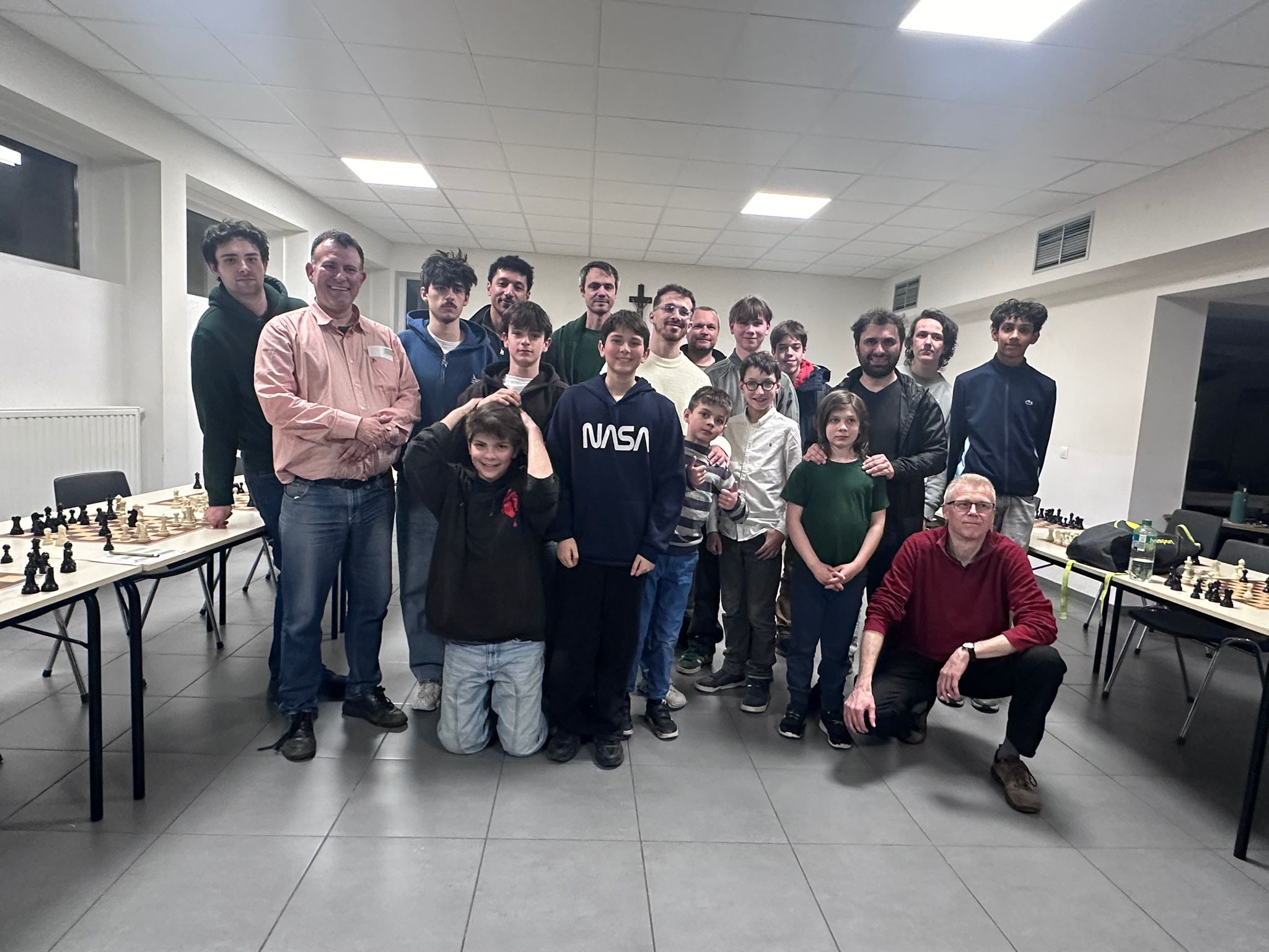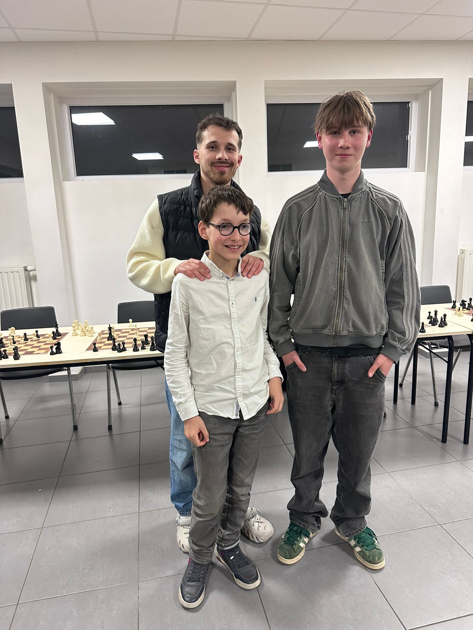 La simultanée a eu lieu le jeudi 16 avril 2026 contre 26 de nos membres pour un résultat de 24 défaites et 2 parties nulles en deux heures. Les joueurs qui font nul sont Maxime Mourlon-Beernaert et Benoît Drugmand qui posent ici avec le grand-maître.